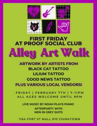 Proof Social Club presents the First Friday Art Walk in Chaplain Lane featuring exhibits from Black Cat Tattoo, Lilium Tattoo, Good News Tattoo and more local artists. With an after-party featuring surf rockers Men In Grey Suits