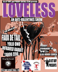 DJ Jet Boy presents an Anti-Valentine's Show at Proof Social Club. LOVELESS- with live music by Faux De Tail, Yolo Ono, Taboo Zero and Infrared Rabbit.
